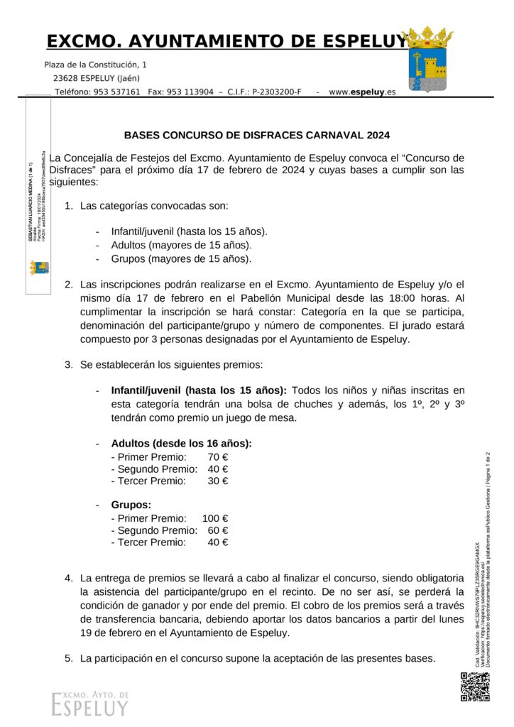 El Excmo. Ayuntamiento de Espeluy acaba de publicar las bases del concurso de Disfraces que tendrá lugar el próximo sábado 17 de febrero. Habrá tres categorías de premios: Una infantil y juvenil, otra para adultos y una tercera para grupos. Toda la información la pueden consultar en las bases y cartel adjunto.